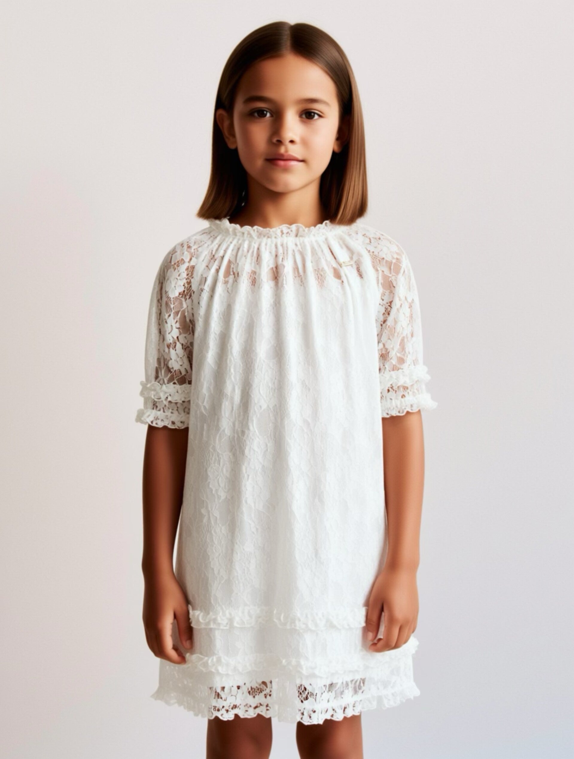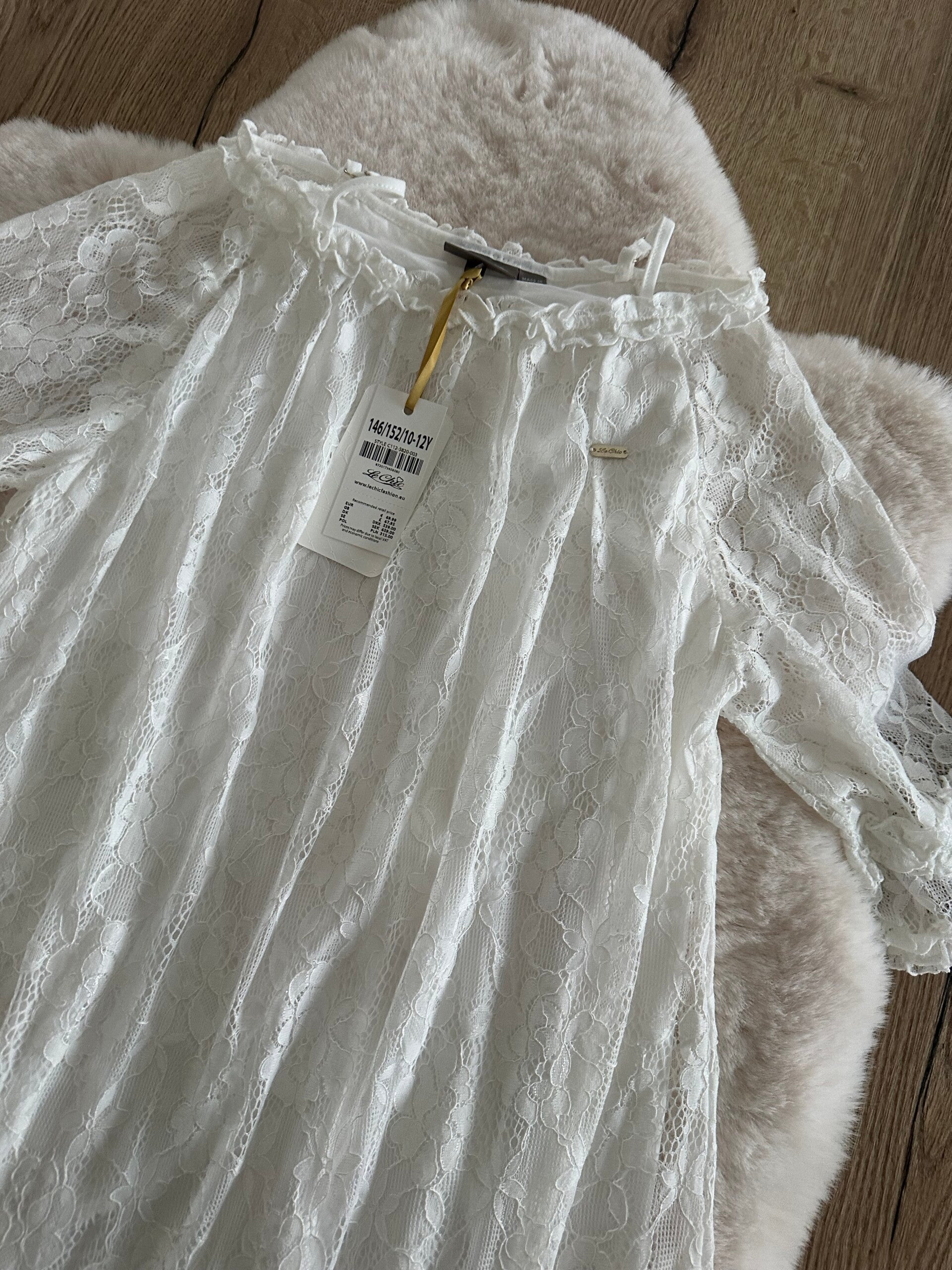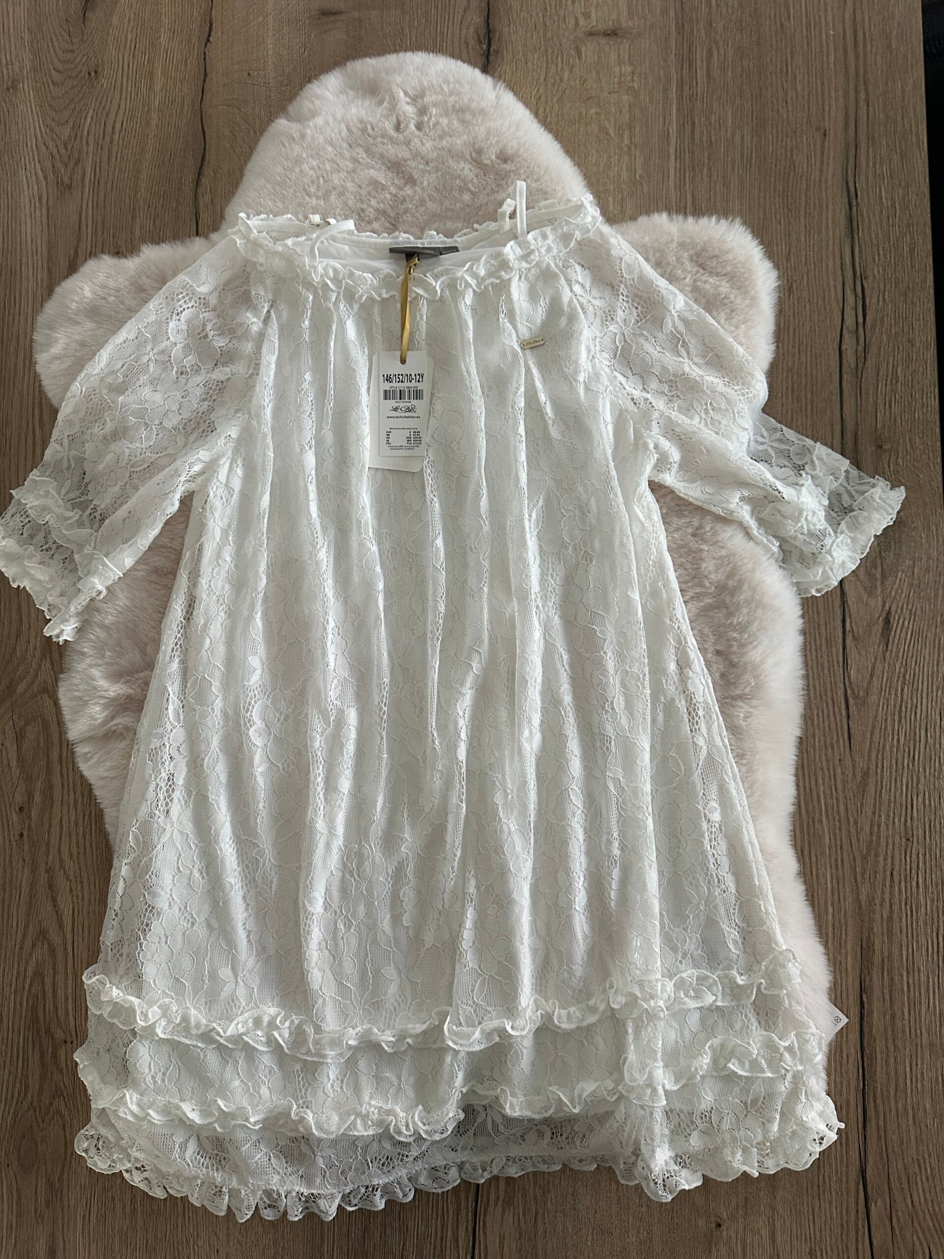 Stap in een wereld van elegantie met deze schitterende witte kanten jurk van het high-end merk Le Chic. Een verfijnd ontwerp dat speciaal is gemaakt voor meiden die willen stralen op hun communie, lentefeest of als bruidsmeisje.