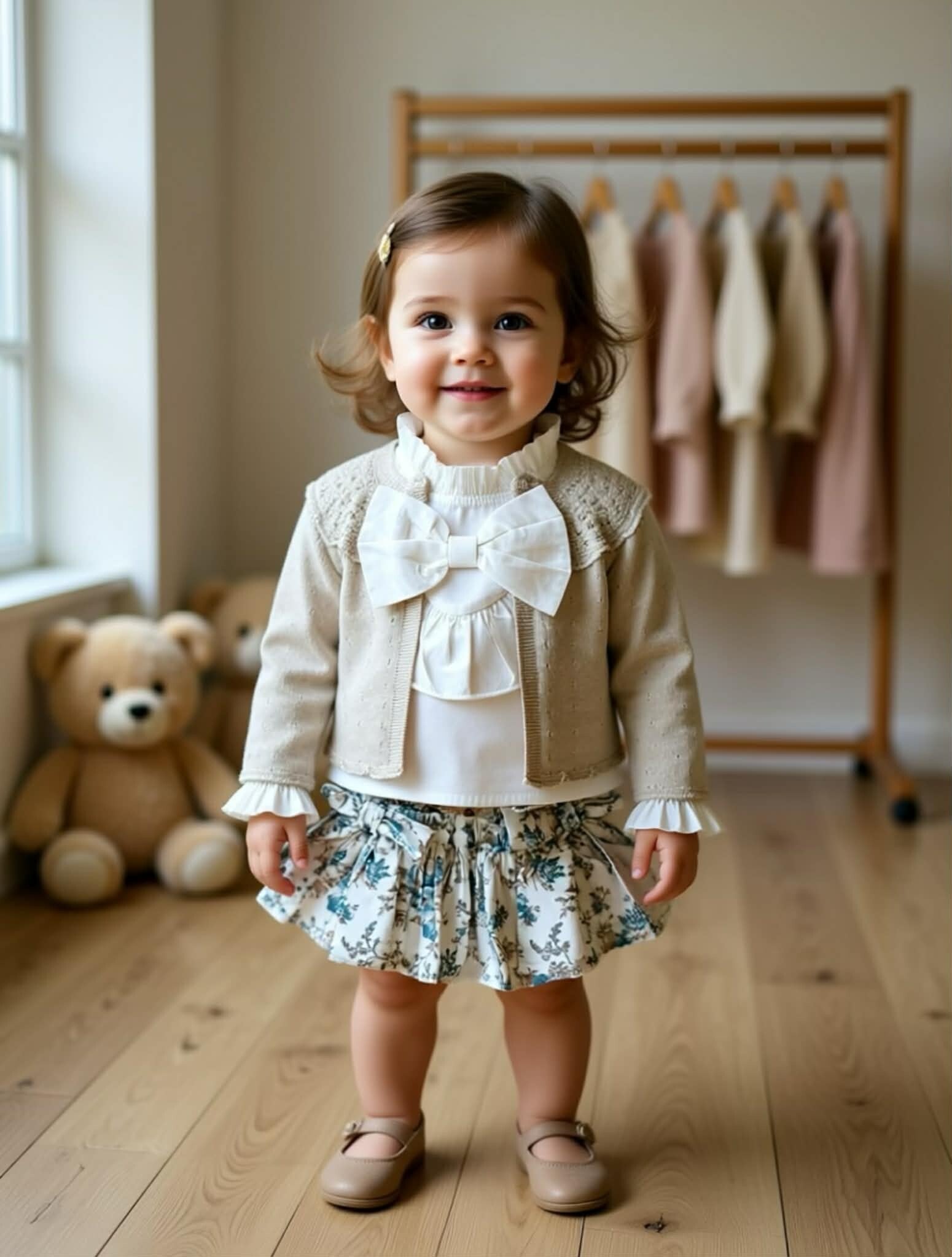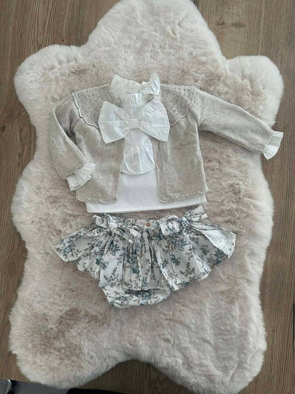 Geef je kleintje een tijdloze look met deze prachtig samengestelde set. De combinatie van het fijngebreide vestje, de blouse met ruches en de bloomer met bloemenprint zorgt voor een elegante verschijning die perfect is voor bijzondere gelegenheden.