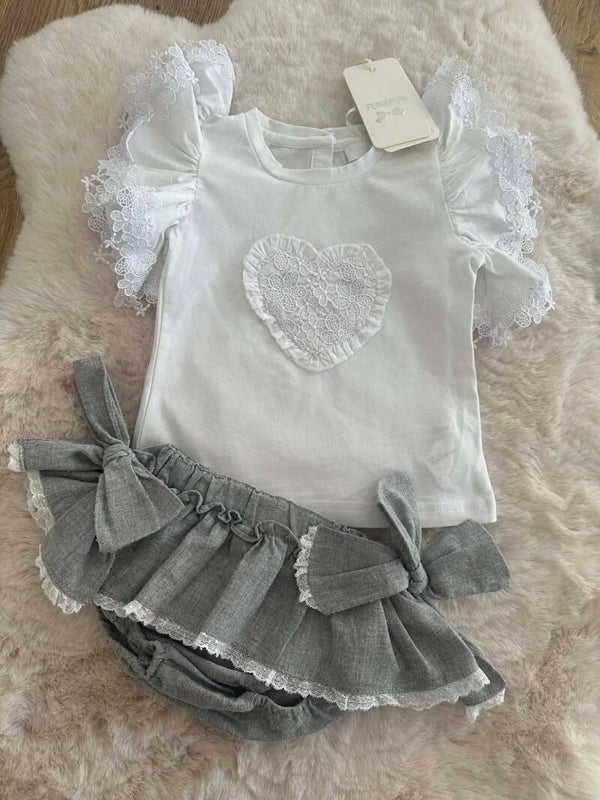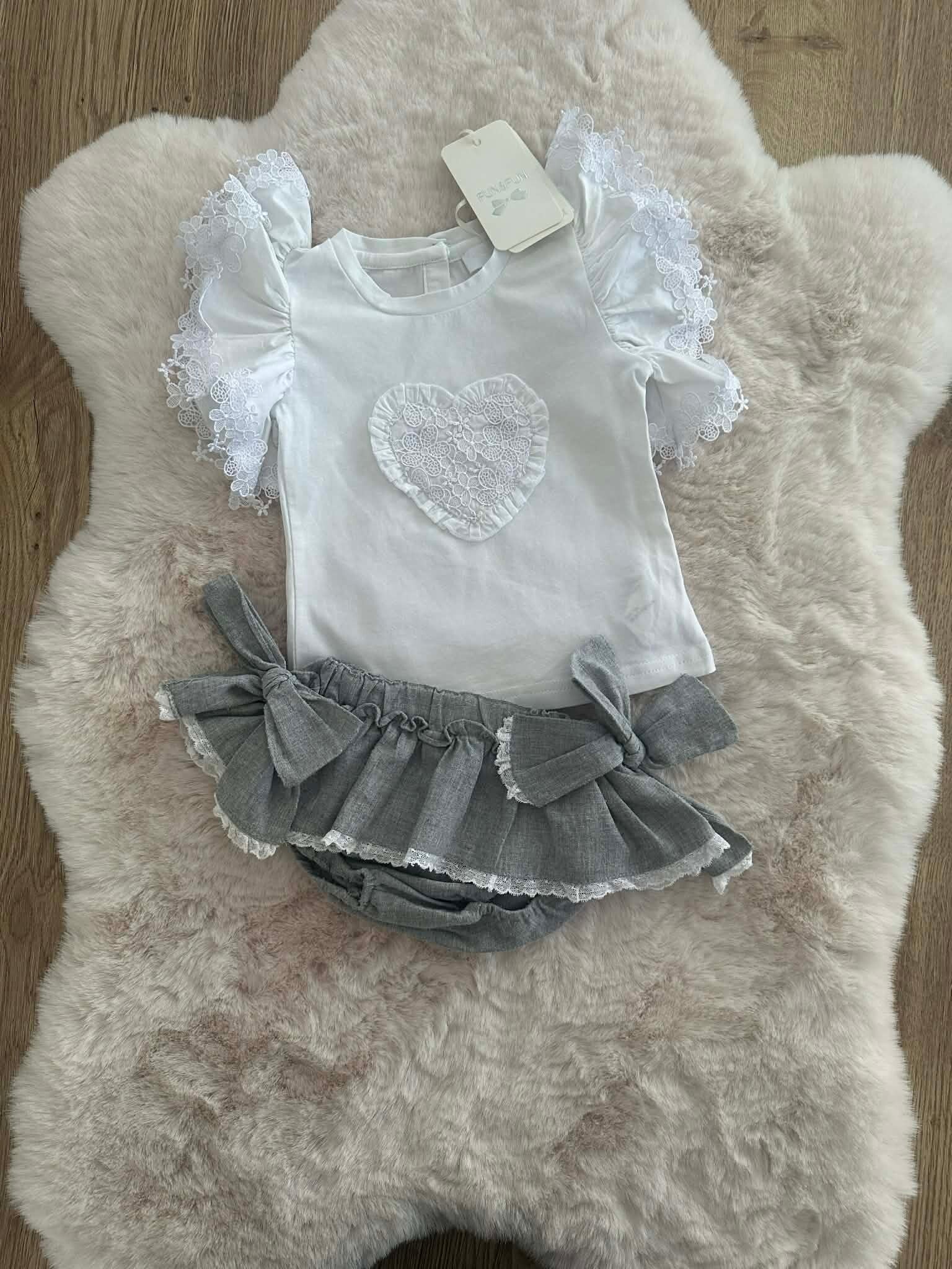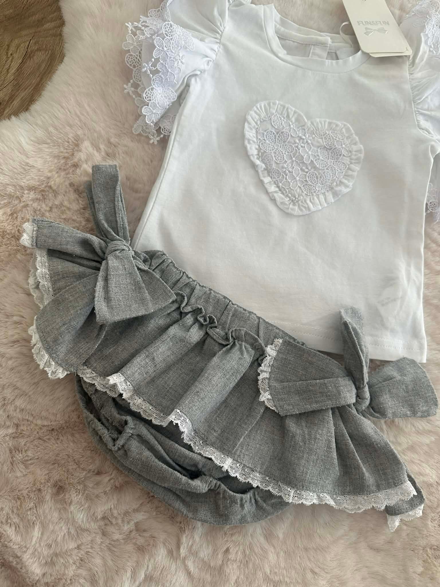 Laat je kleintje stralen in deze zorgvuldig samengestelde set. De combinatie van kraakhelder wit met chic grijs en prachtig kantwerk zorgt voor een tijdloze en luxe uitstraling.