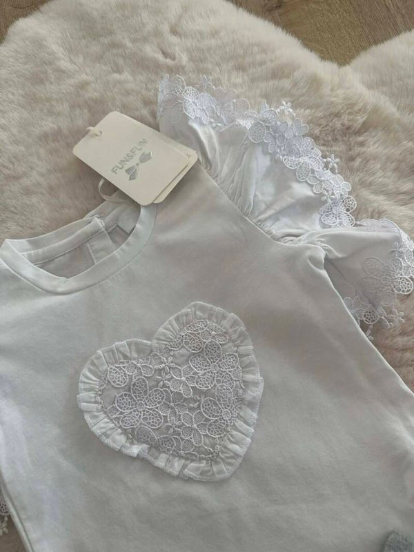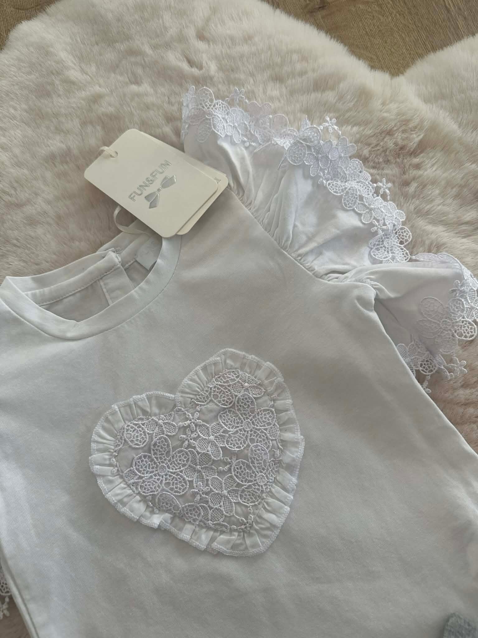 Shirt (Fun&Fun): Een prachtig wit T-shirt met korte mouwen. Het shirt is rijkelijk versierd met kanten ruches op de schouders en een opgewerkt kanten hart op de borst, omringd door kleine ruches. Staat: Nieuw met label.