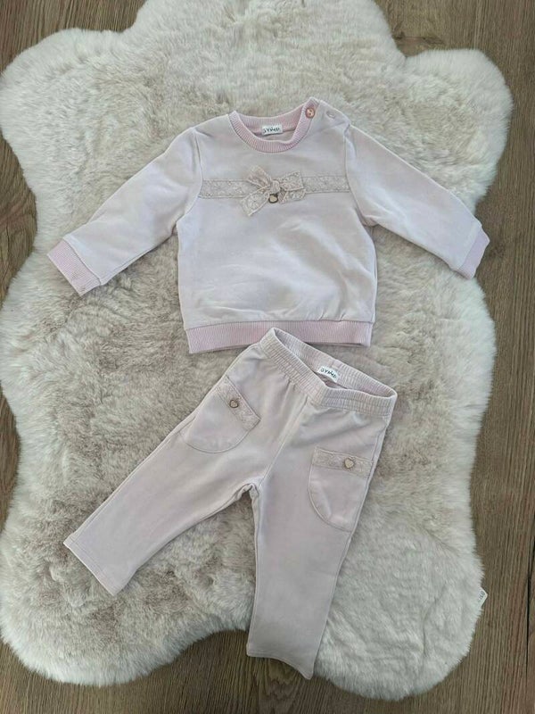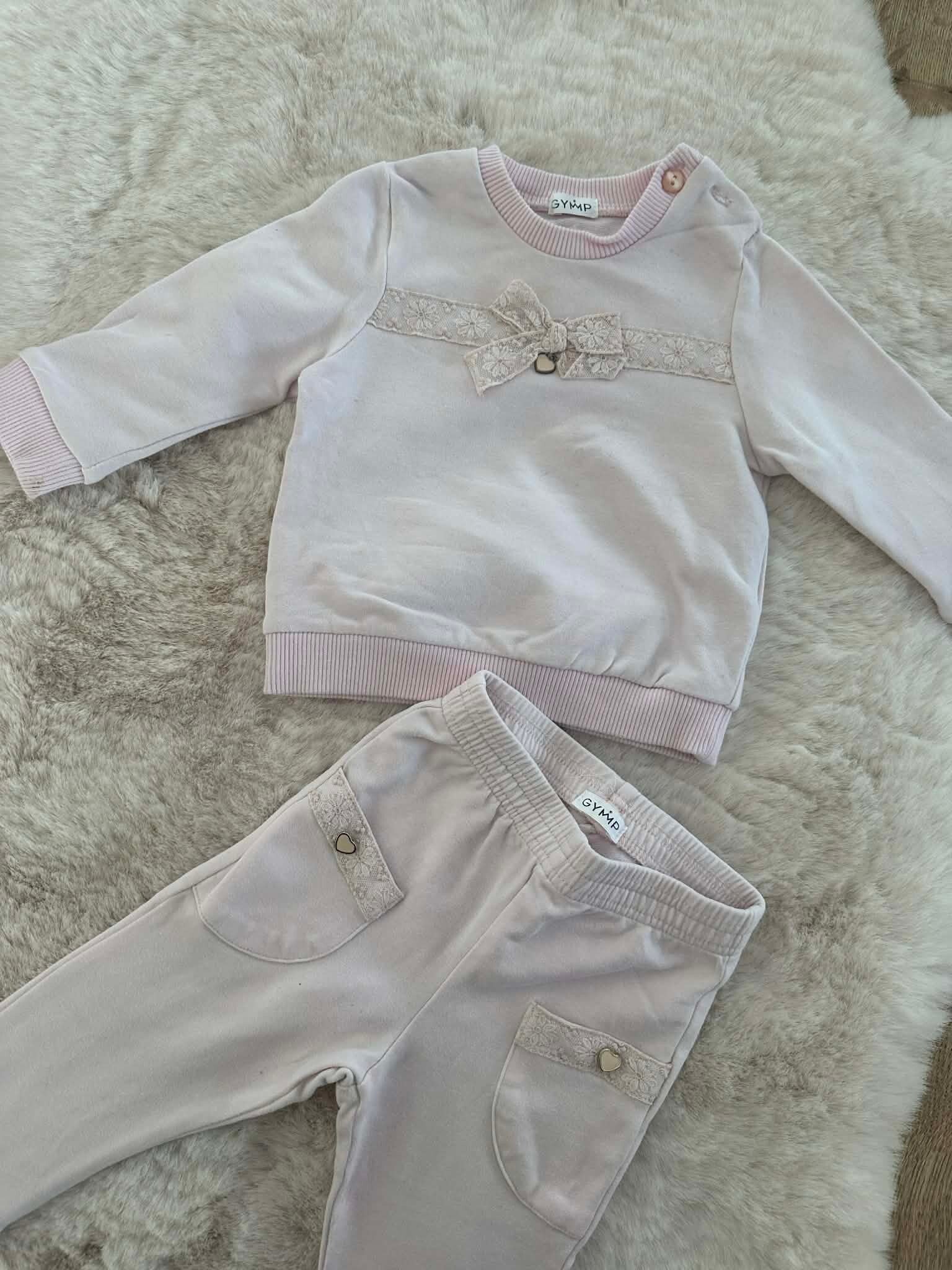 Broekje: Een comfortabele broek met een elastische tailleband. De zakjes aan de voorzijde zijn prachtig afgewerkt met dezelfde kanten details en subtiele hartjes-accenten.