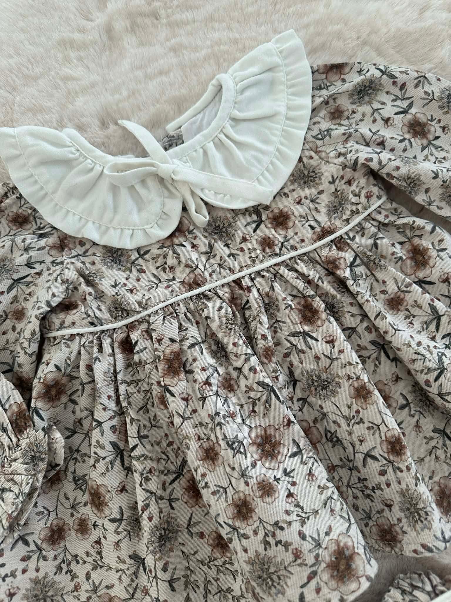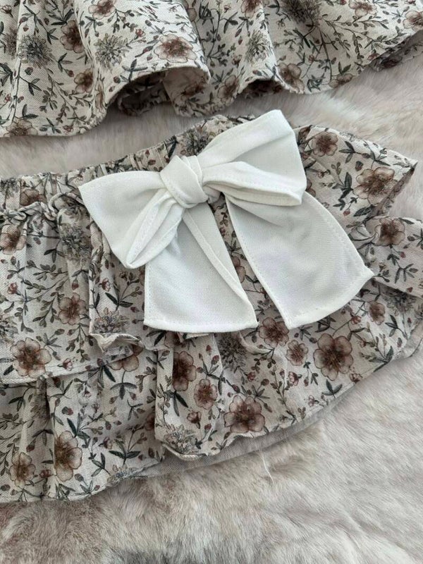 Bloomer: Een bijpassende bloomer met een gedetailleerde bloemenprint in blauw- en bruintinten, afgewerkt met sierlijke ruches en een grote witte strik.