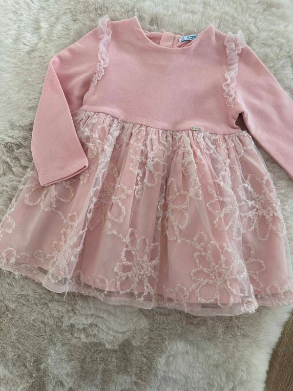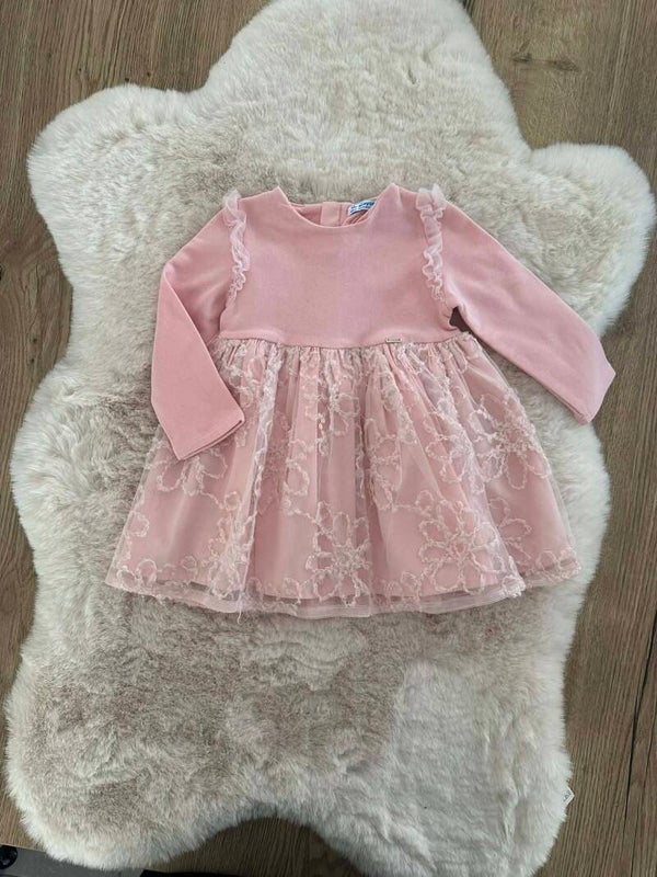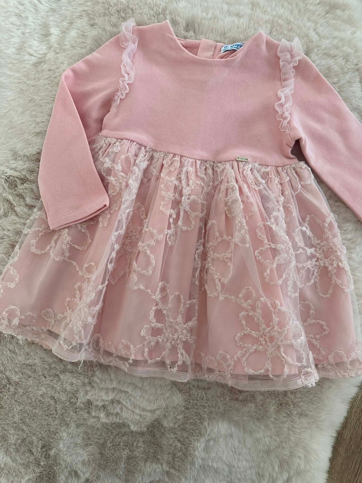 Laat je kleintje stralen in dit romantische jurkje van het Spaanse merk Mayoral. Dit merk staat bekend om zijn stijlvolle ontwerpen en oog voor detail, wat je direct terugziet in de verfijnde afwerking van dit item.