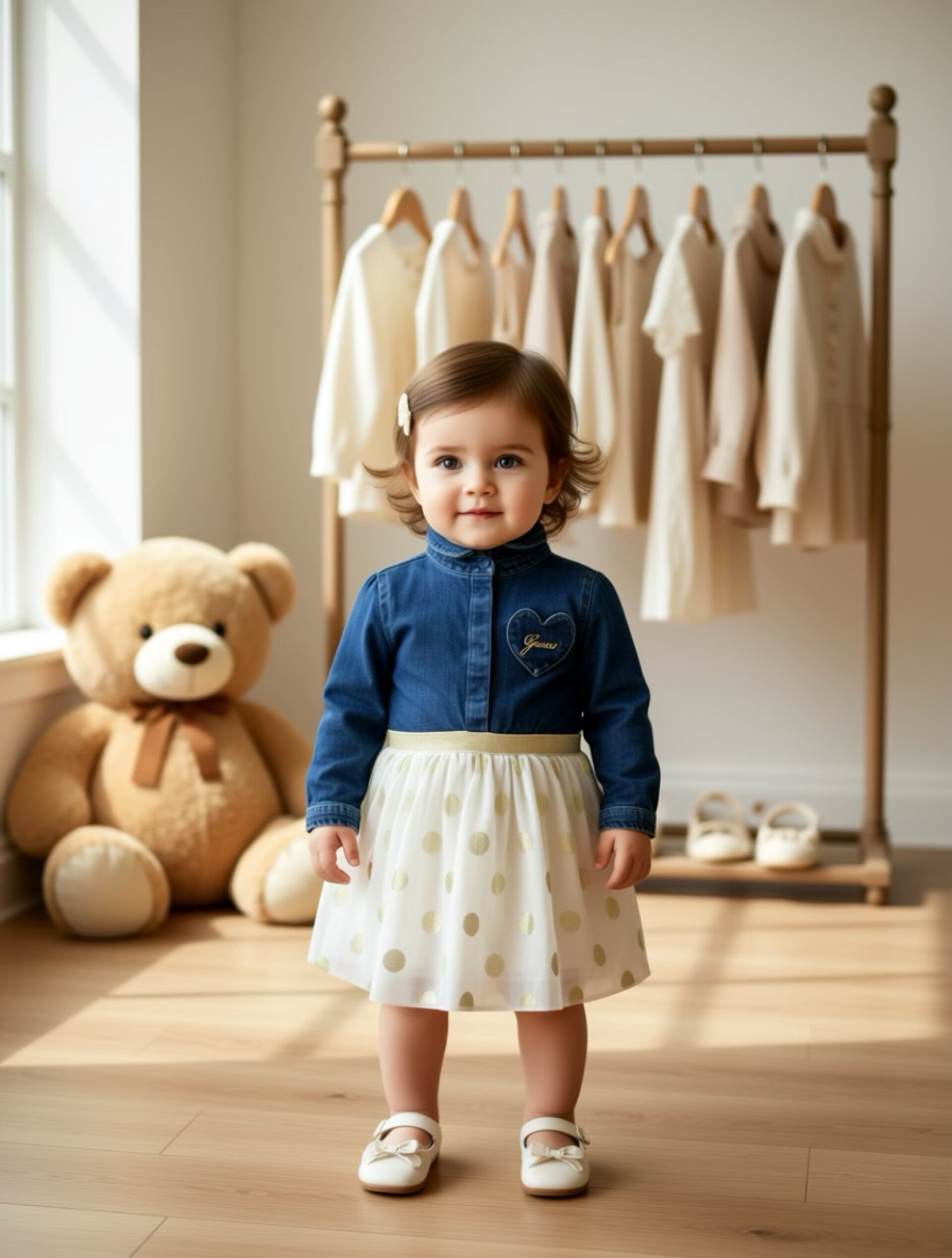 Dit jurkje steelt de show op elk feestje. Combineer het met zilverkleurige ballerina's en witte sokjes met een kanten randje. Op een koelere dag staat een wit kort vestje of een spijkerjasje hier ook heel stoer en modieus bij.