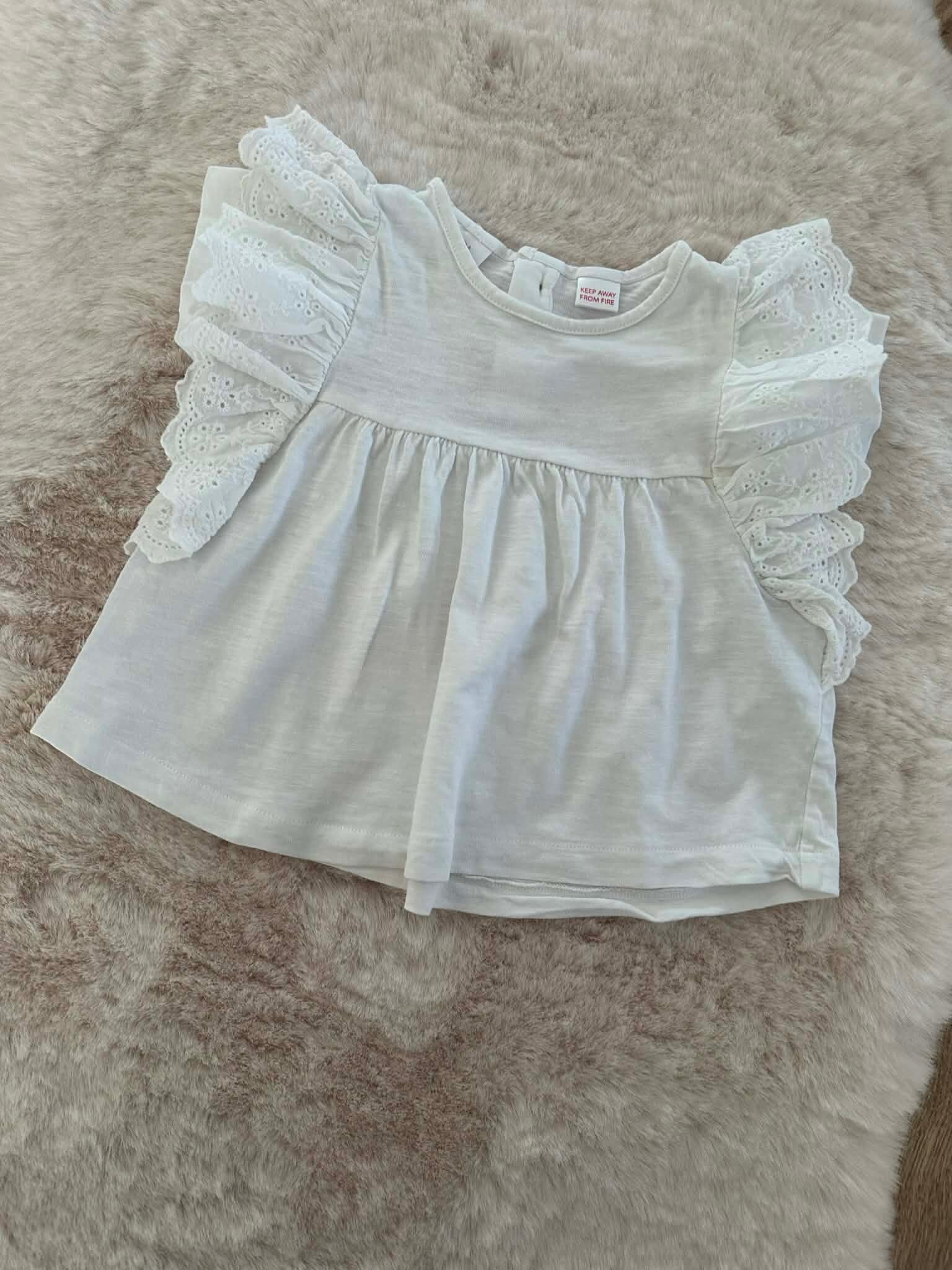 Statement Mouwen: De top is voorzien van prachtige, gelaagde ruches aan de schouders, afgewerkt met fijn broderie anglaise (kantwerk).