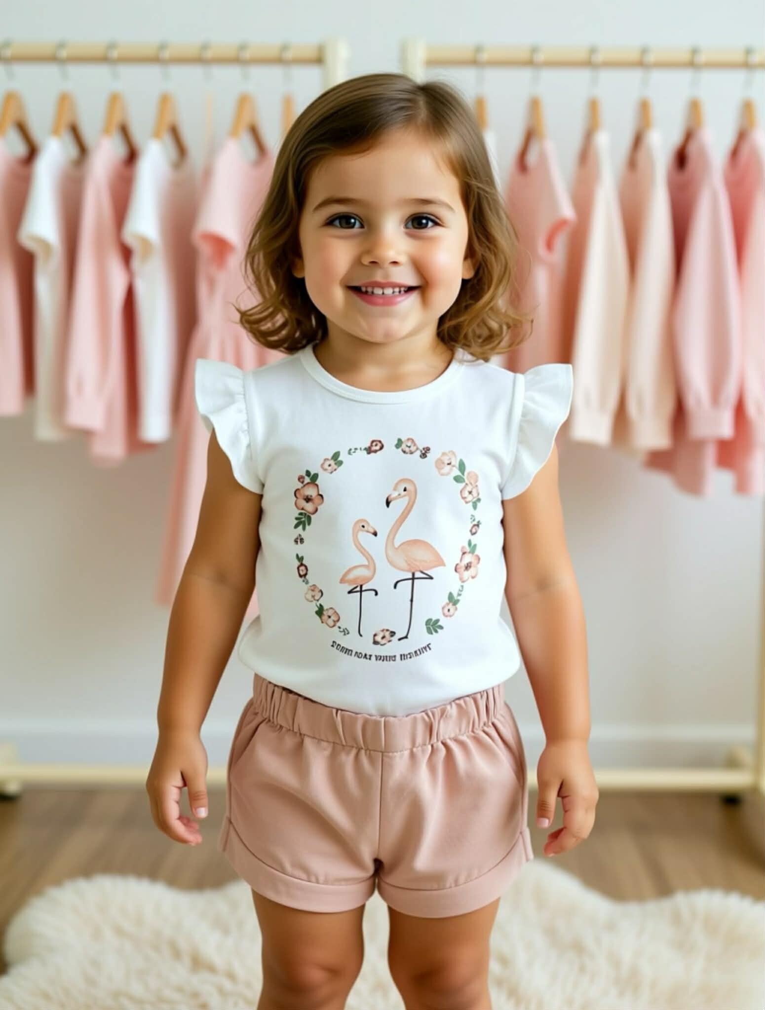 Charmant T-shirt: Een wit shirtje met korte mouwen, voorzien van sierlijke ruches aan de schouders. De voorzijde is versierd met een prachtige print van twee flamingo's omringd door een bloemenkrans.