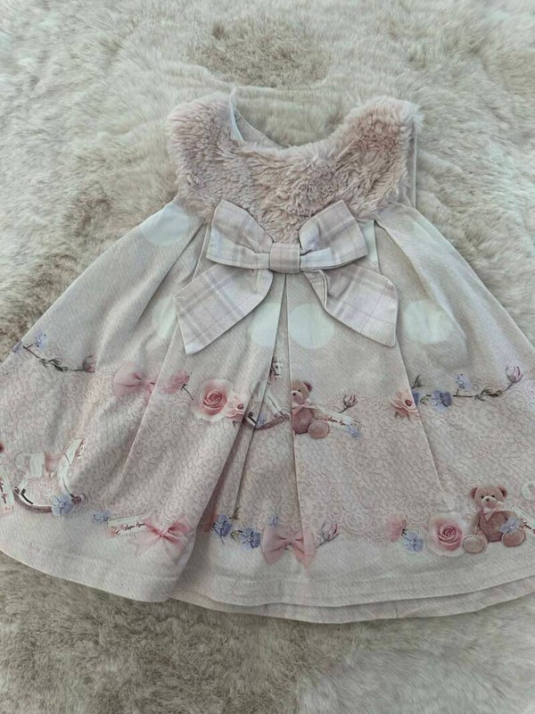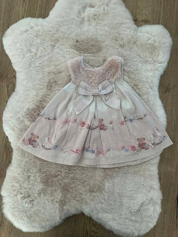 Unieke Details: De bovenzijde is afgewerkt met een heerlijk zachte, roze teddy-stof (faux fur), wat het jurkje een warme en winterse uitstraling geeft.