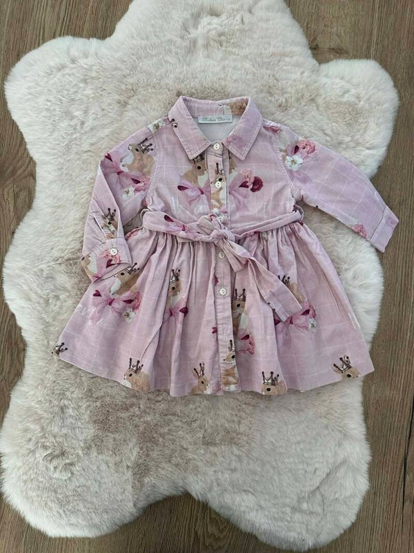 Unieke Print: De jurk is versierd met een sprookjesachtige print van schattige konijntjes met gouden kroontjes en roze strikjes, omringd door prachtige bloemen.