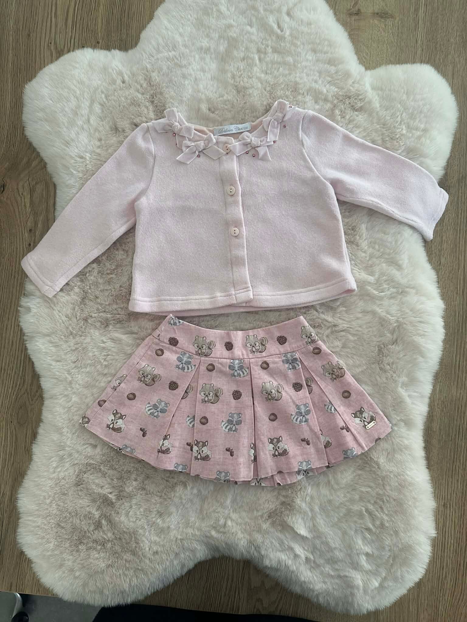 Mayoral Rokje: Een prachtig geplooid rokje in een bijpassende roze kleur. Het rokje is voorzien van een schattige all-over print met wasbeertjes en eekhoorntjes, wat zorgt voor een speels effect.