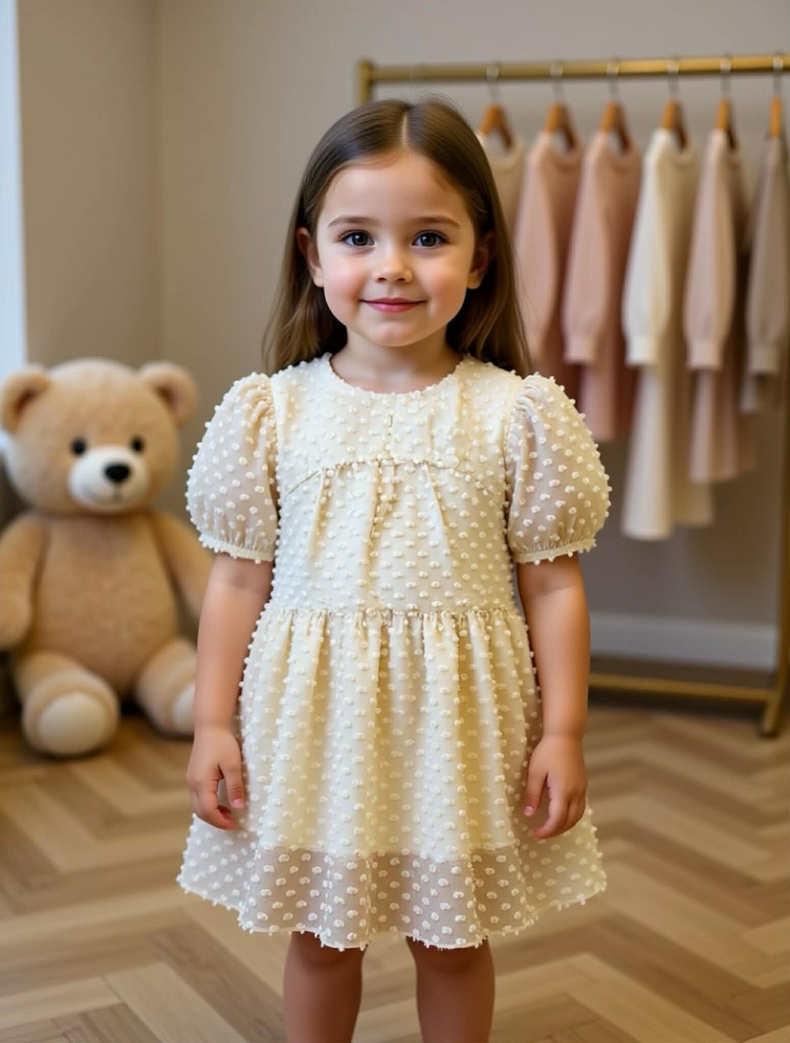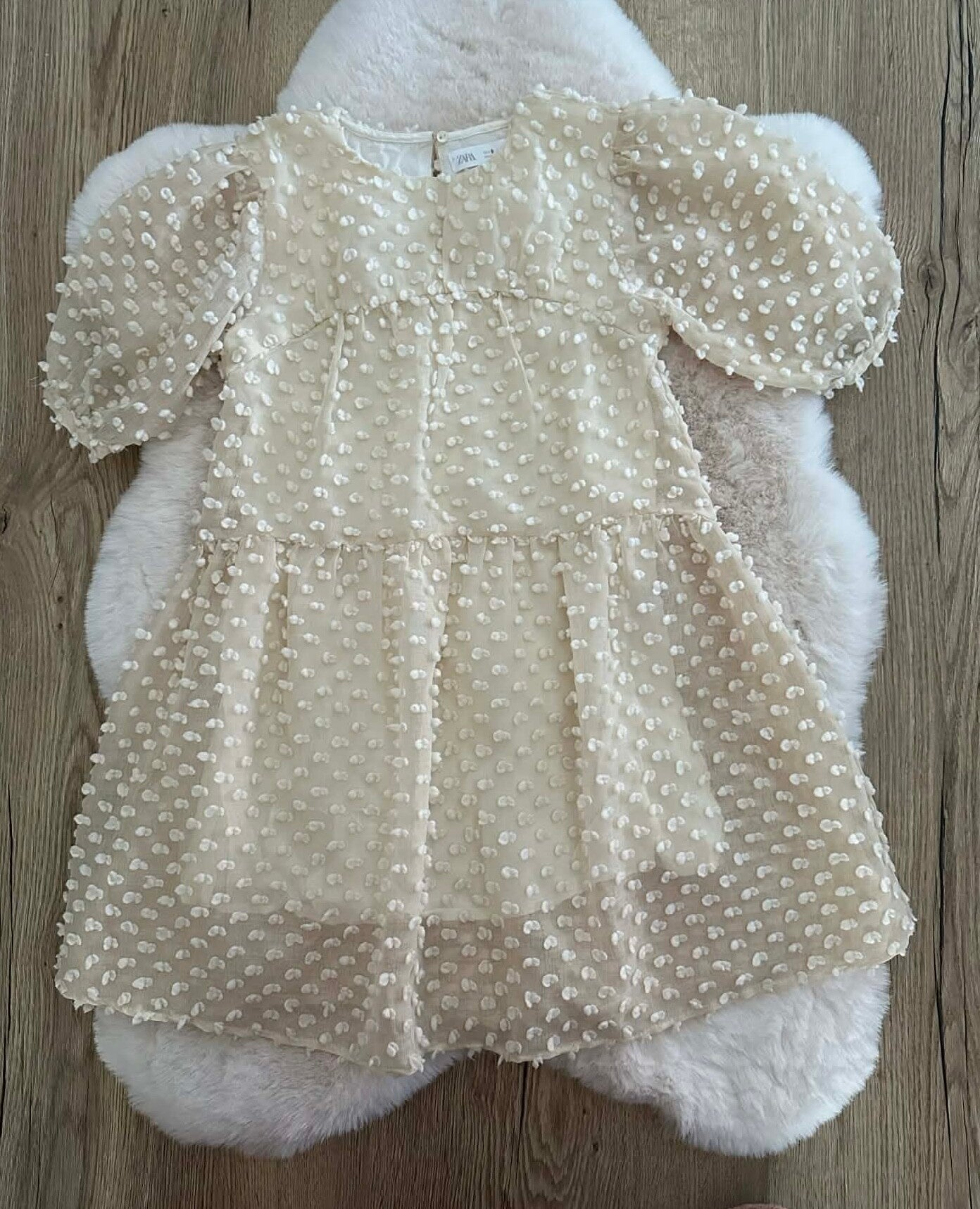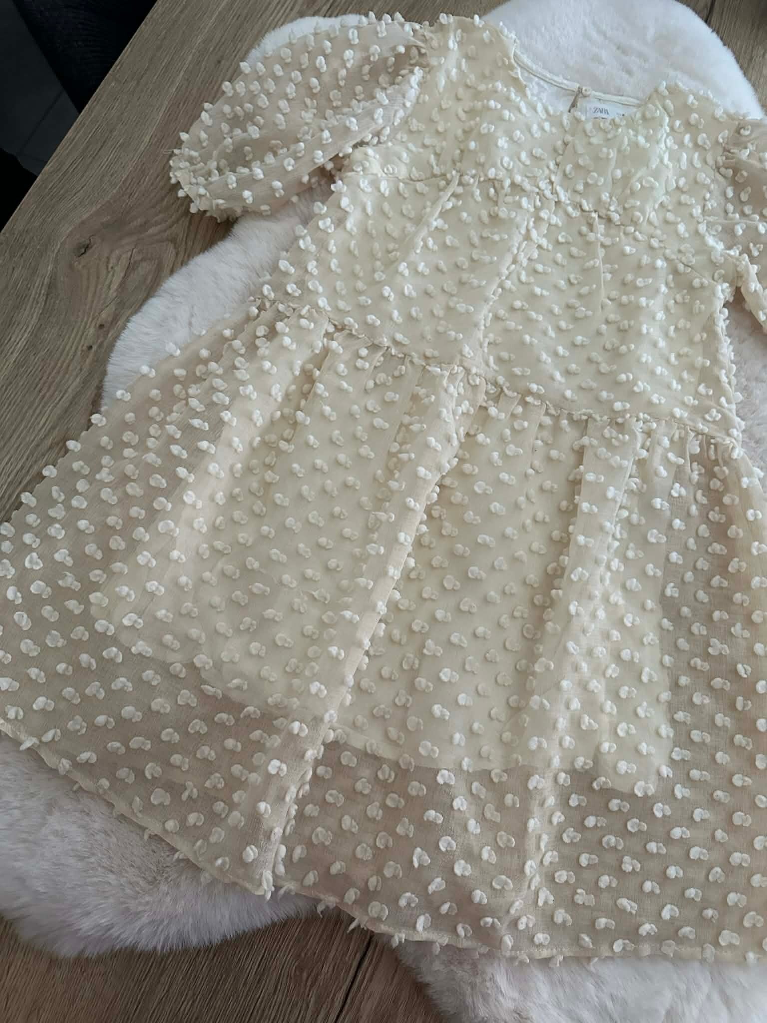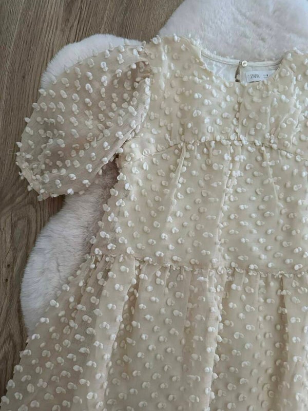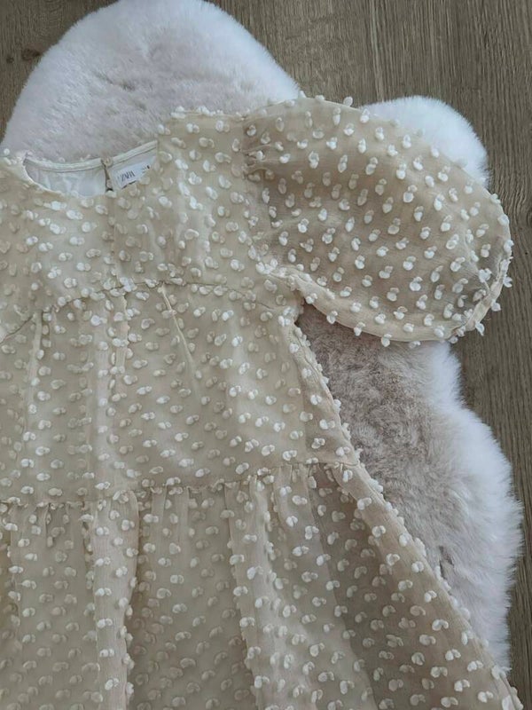 Met deze jurk van Zara Kids steelt je dochter gegarandeerd de show. De jurk heeft een dromerige uitstraling door de transparante stof en de schattige textuur, perfect voor een communie, bruiloft of een ander bijzonder feestje.