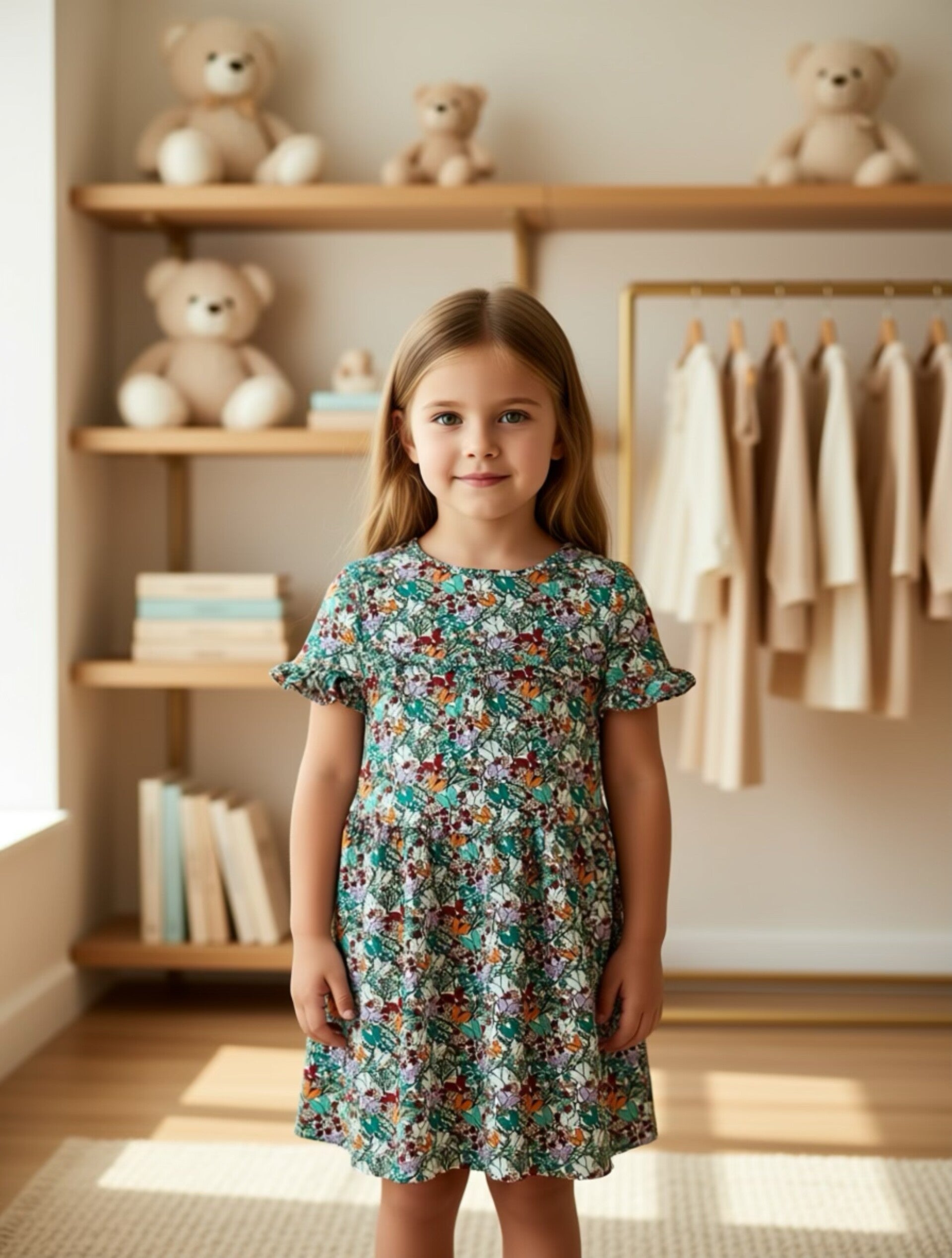 Een echte eyecatcher waar elk meisje blij van wordt. Door de vele kleuren in de print is de jurk heel makkelijk te combineren met verschillende sandaaltjes of een vestje.