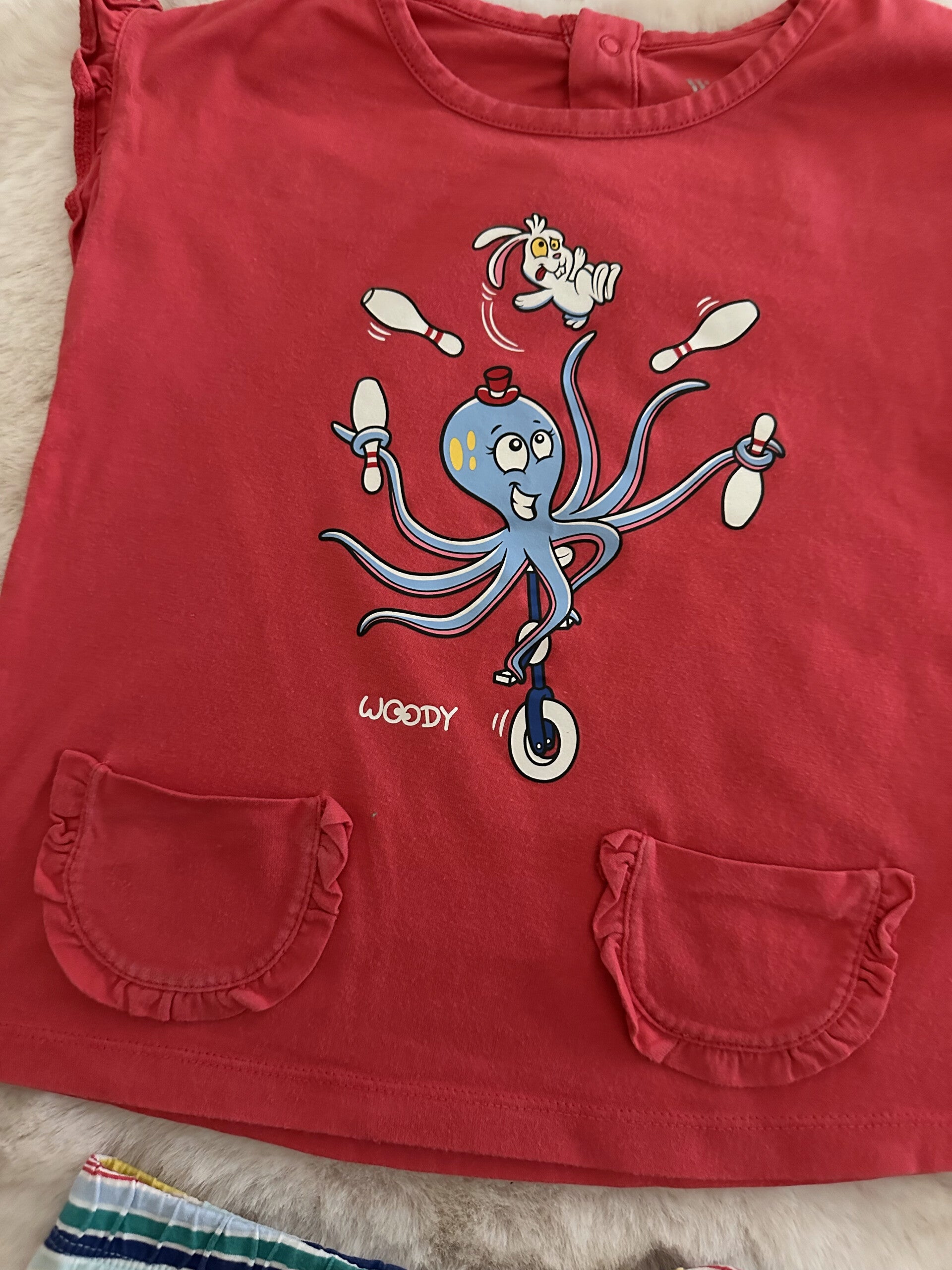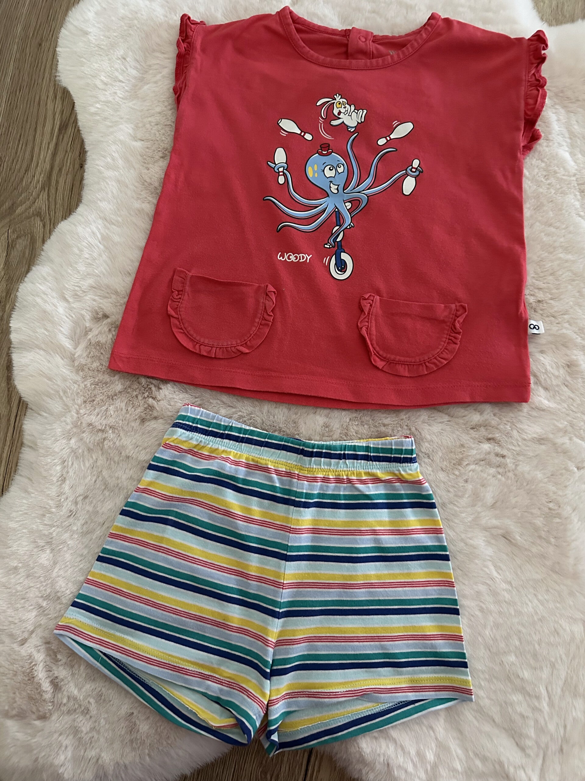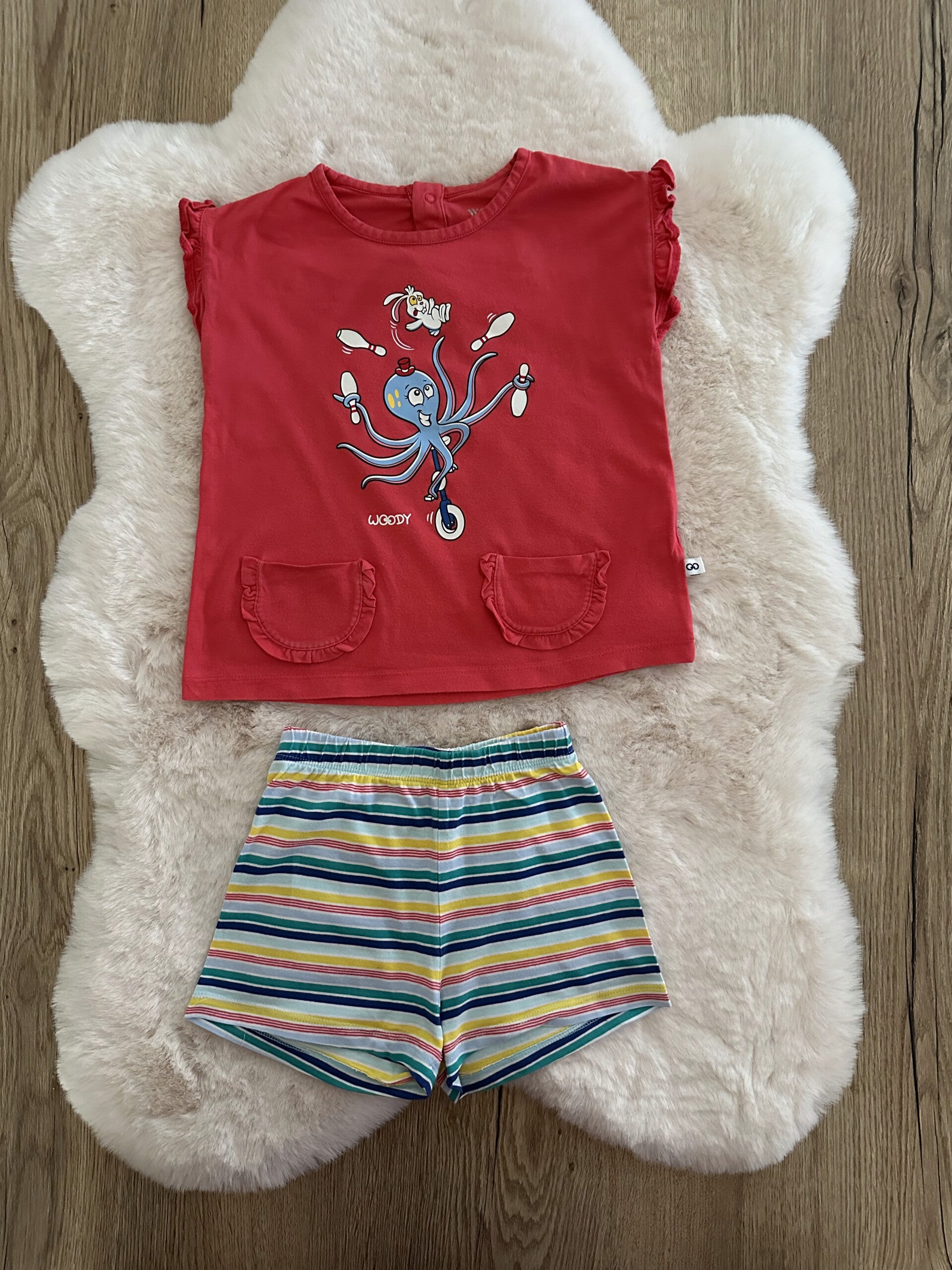 Klaar voor een dromerig circusavontuur? Deze vrolijke rode Woody pyjama met een jonglerende octopus brengt direct een lach op het gezicht van je kleintje. De set bestaat uit een comfortabel shirt met korte mouwen en een bijpassend gestreept shortje. Perfect voor warme nachten of gezellige ochtenden aan de ontbijttafel.