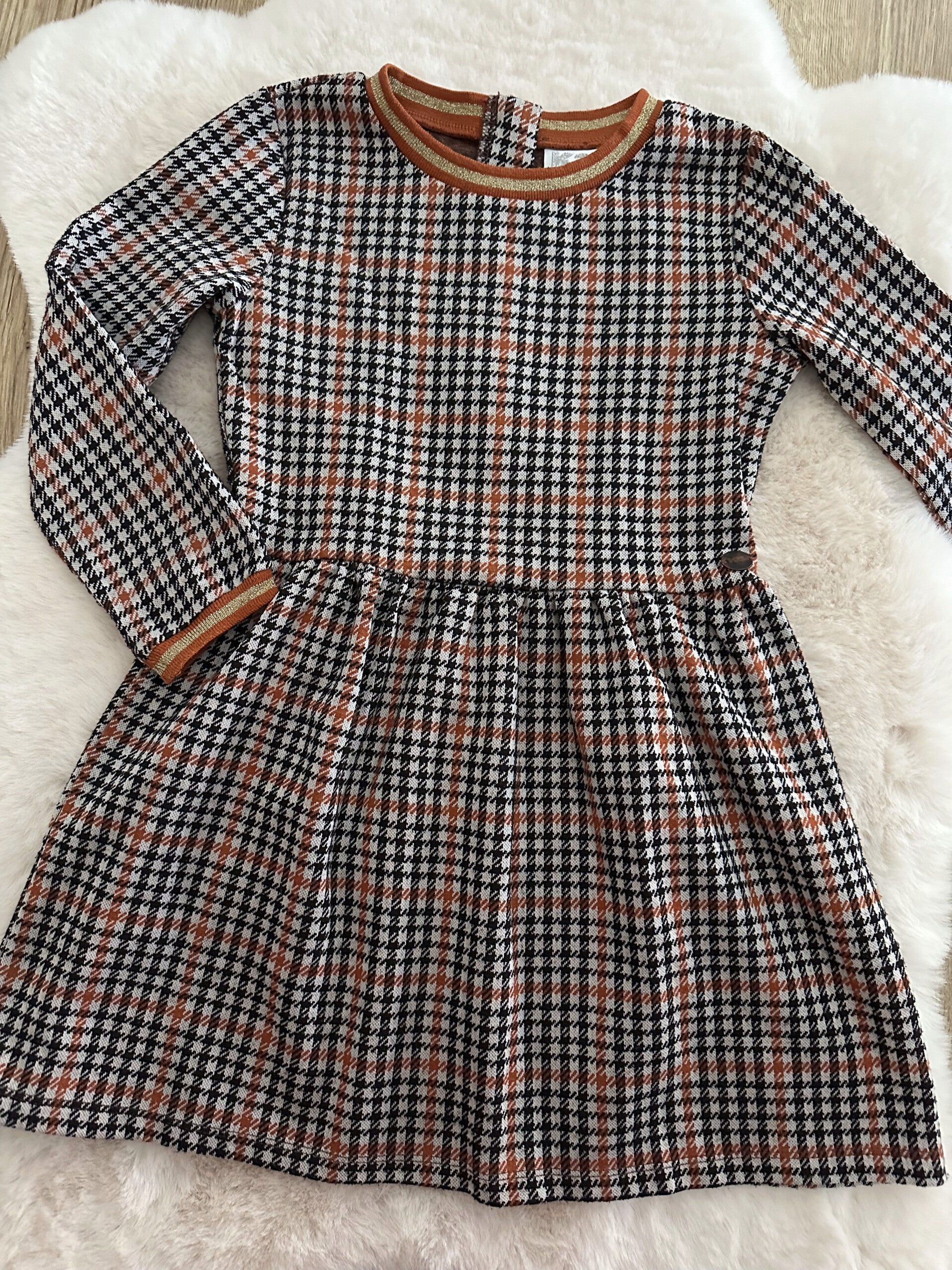 Dit prachtige jurkje van JBC is een echte eyecatcher. Met een tijdloos geruit patroon in warme tinten (zwart, wit en cognac) is dit het ideale item voor het najaar of de winter. De subtiele goudkleurige glitterboordjes aan de hals en mouwen geven het geheel een feestelijke touch waar elk meisje blij van wordt.