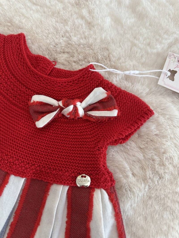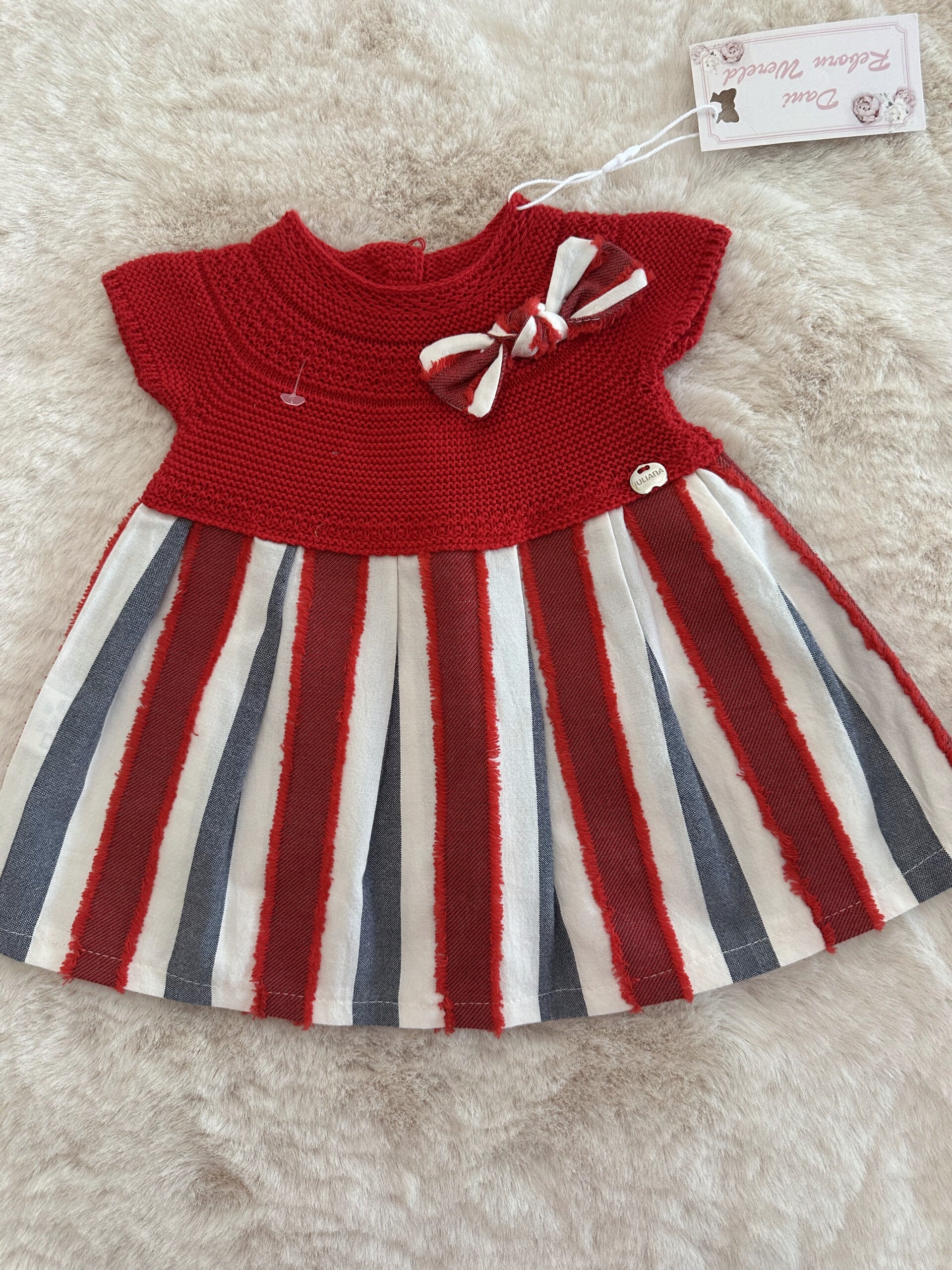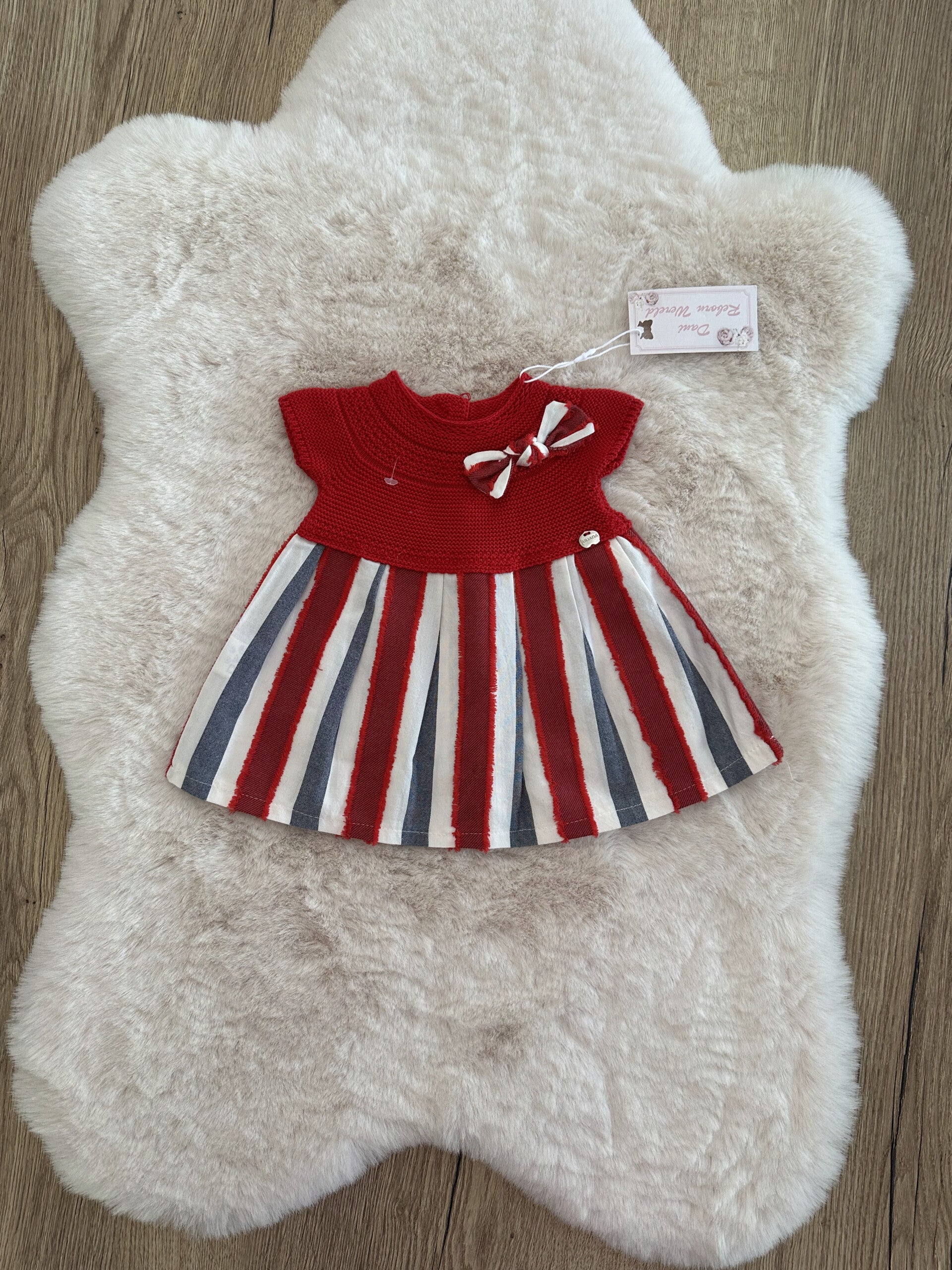 Prachtig jurkje van Juliana in maat 56. Dit stijlvolle jurkje combineert een fijn gebreid rood bovenstuk met een speels rokje in strepen (rood, wit en blauw), wat zorgt voor een klassieke en tegelijk vrolijke uitstraling.