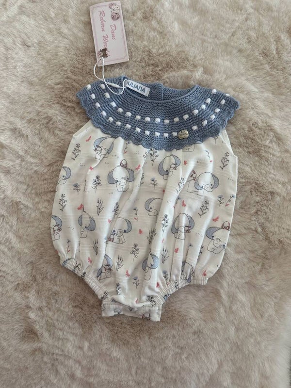 Prachtig rompertje van Juliana in maat 50. Dit schattige stuk combineert een fijn gebreid blauw bovenstuk met een zacht ondergedeelte met lieve print (olifantjes en subtiele details).